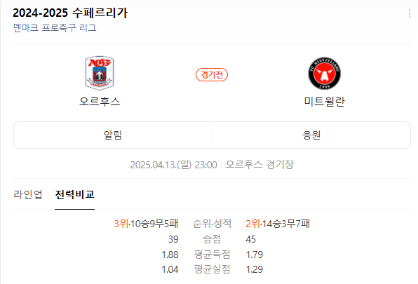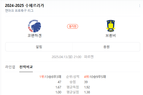 [덴마크 수페르리가]2025년 04월 13일 FC 코펜하겐 브뢴비 IF/오르후스 GF FC 미트윌란 경기 분석