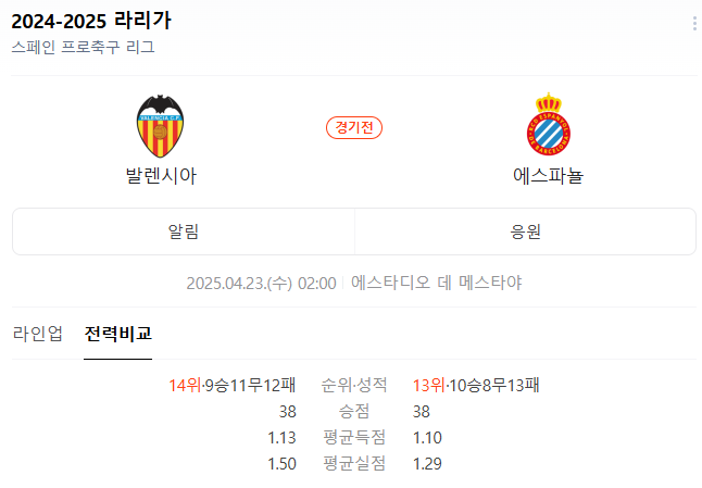 2025년 04월 23일 발렌시아 CF와 RCD 에스파뇰 경기 분석 및 예측