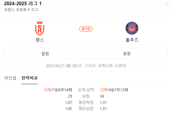 2025년 04월 21일 OGC 드 니스 코트다쥐르 앙제 SCO/스타드 드 랭스 툴루즈 FC 경기분석 및 경기 예측을 소개하고자 합니다.
