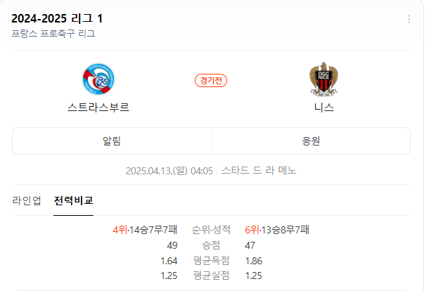2025년 04월 13일 스트라스부르 vs 니스 경기 분석 및 예측