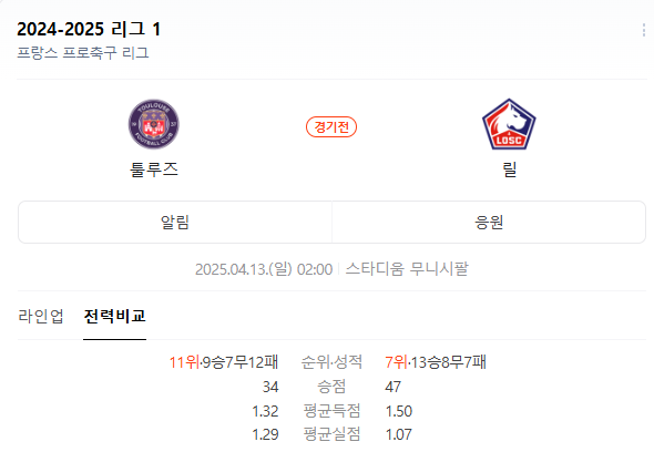 2025년 04월 13일 툴루즈 FC vs 릴 OSC 경기 분석 및 예측