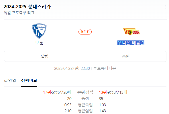 [분데스리가 경기] 2025년 04월 27일 아인트라흐트 프랑크푸르트 라젠발스포르트 라이프치히/VfL 보훔 1848 1. FC 우니온 베를린 경기 분석 및 경기 예측을 소개하고자 합니다.