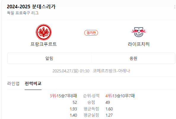 프랑크푸르트와 라이프치히의 경기는 독일 분데스리가의 중요한 대결로, 두 팀 모두 승점 확보가 절실한 상황입니다. 프랑크푸르트는 홈에서의 강세를 보이고 있으며, 라이프치히는 원정에서의 불안정한 성적이 문제로 지적되고 있습니다.