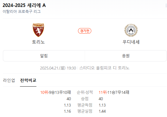 2025년 4월 21일, 토리노 FC와 우디네세 칼초의 경기가 예정되어 있습니다. 이 경기는 이탈리아 세리에 A의 중요한 일정 중 하나로, 두 팀 모두 승점 확보를 위해 필사적으로 싸울 것입니다.