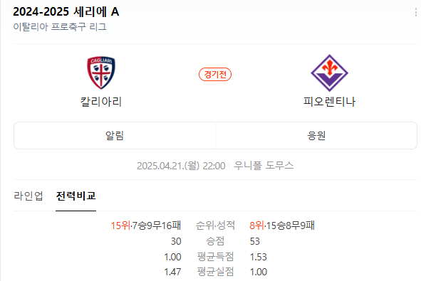 2025년 4월 21일, 칼리아리와 ACF 피오렌티나의 경기는 사르디니아의 사르데냐 아레나에서 열릴 예정입니다. 이번 경기는 세리에 A의 중요한 일정으로, 두 팀 모두 승리가 절실한 상황입니다. 특히 칼리아리는 홈경기에서 팬들의 응원을 받아 더욱 강한 모습을 보여줄 것으로 예상됩니다.