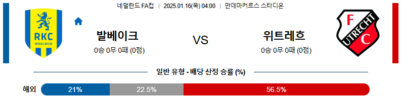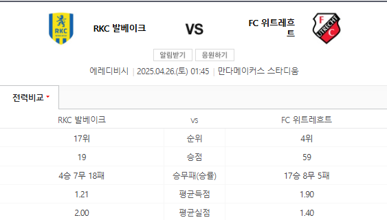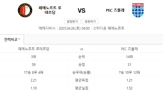 2025년4월26일 RKC 발베이크 FC 위트레흐트/ 페예노르트 로테르담 PEC 즈볼레 경기 분석 및 경기 예측을 소개하고자 합니다.