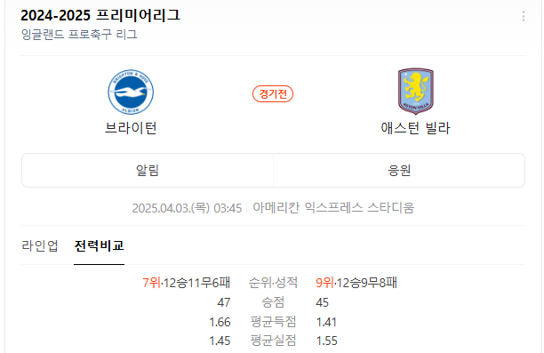 브라이턴과 애스턴 빌라의 경기는 2025년 4월 2일 이 경기는 브라이턴의 홈구장인 아메리칸 익스프레스 커뮤니티 스타디움에서 열리며, 많은 팬들이 이 경기를 기다리고 있습니다.