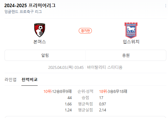 경기는 2025년 04월 03일 오후 3시(한국 시간)부터 시작됩니다. 본머스는 최근 몇 경기에서 좋은 성적을 내고 있으며, 입스위치 또한 상승세를 타고 있습니다. 두 팀의 맞대결은 항상 흥미로운 경기가 되곤 했습니다.