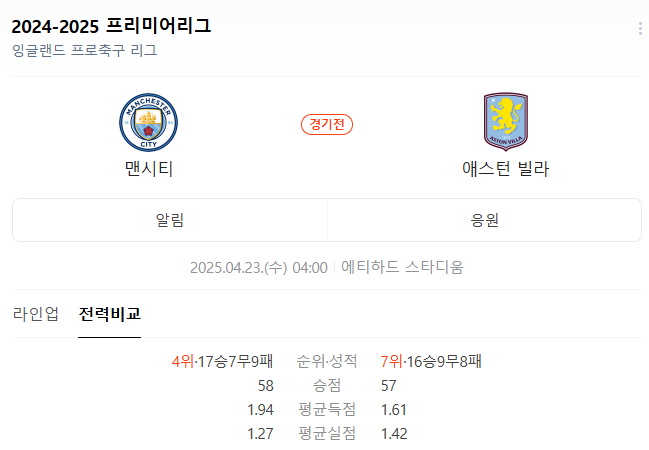 이번 경기는 프리미어리그의 중요한 대결로, 맨체스터 시티는 홈에서 애스턴 빌라를 맞이합니다. 두 팀 모두 승점이 중요한 상황에서 치러지는 만큼, 치열한 경기가 예상됩니다. 맨체스터 시티는 최근 챔피언스리그에서 탈락한 아픔을 안고 있으며, 리그에서의 반등을 노리고 있습니다. 반면 애스턴 빌라는 리그 7위에 올라 있으며, 5위 맨체스터 시티와의 승점 차가 단 1점에 불과해 더욱 긴장감이 감돕니다.