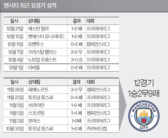 맨체스터 시티는 최근 12경기에서 1승, 2무, 9패라는 부진한 성적을 기록하고 있습니다. 이러한 성적은 팀의 사기를 저하시킬 수 있으며, 팬들의 우려를 낳고 있습니다.