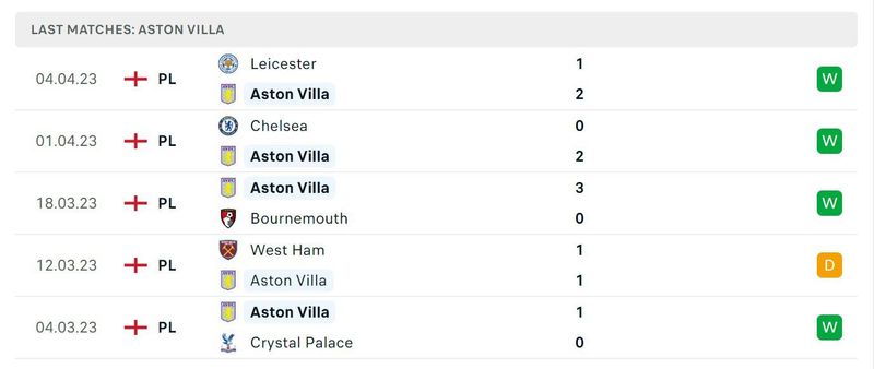 애스턴 빌라는 최근 5경기에서 4승 1무의 성적을 기록하며 상승세를 타고 있습니다. 특히, 리그에서의 성적이 매우 좋습니다.