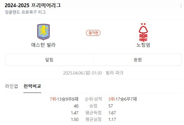 2025년 4월 6일, 애스턴 빌라와 노팅엄 포레스트의 경기가 예정되어 있습니다. 이 경기는 영국의 빌라 파크에서 열리며, 팬들에게는 기대되는 매치업입니다. 두 팀 모두 프리미어 리그에서 중요한 경기를 치르게 되며, 팬들의 열기가 뜨거울 것으로 예상됩니다. 🏟️