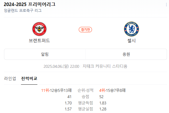 2025년 4월 6일, 브렌트포드의 홈구장인 지테크 커뮤니티 스타디움에서 첼시와의 경기가 오후 10시에 시작됩니다. 이 경기는 두 팀 모두에게 중요한 의미가 있으며, 팬들의 기대가 큽니다.