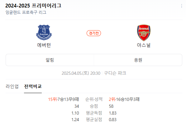 2025년 4월 5일, 에버턴과 아스널의 경기는 영국 리버풀에 위치한 구디슨 파크에서 열립니다. 많은 팬들이 이 경기를 기다리고 있습니다.