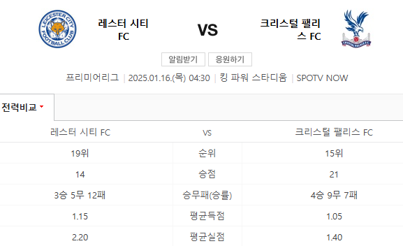 - 수비 불안정: 레스터 시티는 여전히 수비에서의 조직력 부족과 실점이 많은 문제를 안고 있습니다. 크리스탈 팰리스와 같은 역습 강한 팀에게 취약할 수 있습니다.