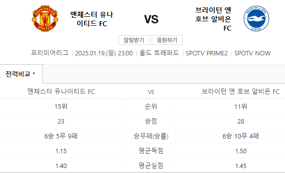 팀 성적: 맨체스터 유나이티드는 상위권 경쟁을 목표로 하는 팀으로, 최근 몇 시즌 동안 불안정한 성적을 기록했지만 여전히 강력한 공격력과 수비진의 개선을 목표로 하고 있습니다. 에릭 텐 하흐 감독 하에 전술적 안정을 추구하고 있으며, 유럽 대회에서도 꾸준히 좋은 성적을 거두고 있습니다.