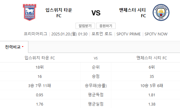 - 공격의 불확실성: 입스위치는 강력한 공격수나 대단히 창의적인 미드필더가 부족한 팀으로, 주로 세트피스나 빠른 역습을 통해 기회를 노립니다. 맨시티의 강력한 수비를 뚫는 것이 주요 과제가 될 것입니다.