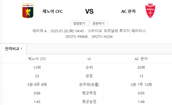제노아와 몬차의 경기는 이탈리아 세리에 A의 일환으로 진행됩니다. 제노아는 홈에서 경기를 치르며, 홈 경기의 이점을 살려 승리를 노리고 있습니다. 반면 몬차는 반격을 위해 최선을 다할 것입니다. 두 팀 모두 승점이 절실한 상황이기 때문에, 치열한 경기가 예상됩니다.
