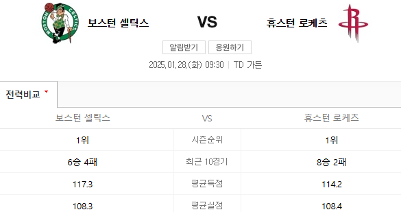 - 대진: 보스턴 셀틱스 (홈) vs 휴스턴 로켓츠 (원정)
