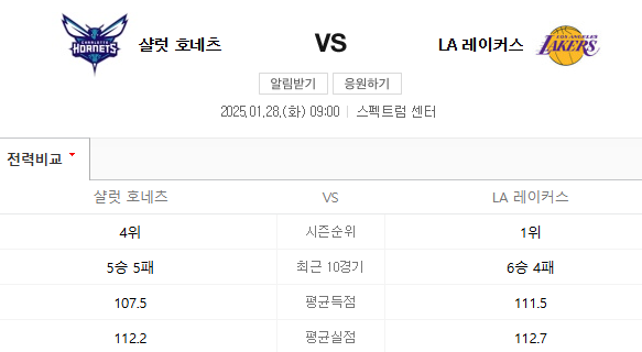 이번 28일 NBA 경기에서는 샬럿 호네츠와 LA 레이커스의 맞대결이 예정되어 있습니다. 두 팀의 현재 상황과 선수들의 컨디션을 분석하여 경기 예측을 해보겠습니다.