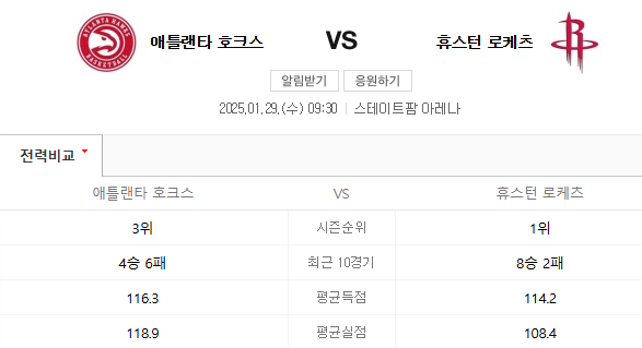 애틀랜타 호크스는 현재 시즌에서 25승 12패의 성적을 기록하고 있으며, 최근 경기에서 좋은 흐름을 이어가고 있습니다. 반면, 휴스턴 로켓츠는 20승 17패로, 최근 멤피스 그리즐리스와의 경기에서 119-115로 승리하며 3연승을 기록했습니다. 두 팀 모두 승리를 위해 최선을 다할 것으로 예상됩니다.