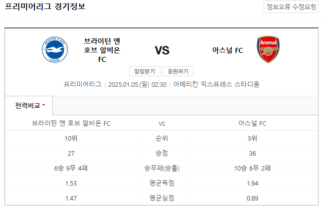 2025년 1월 5일 새벽 2시 30분(한국 시간), 브라이턴 & 호브 알비온과 아스널의 프리미어리그 20라운드 경기가 브라이턴의 아메리칸 익스프레스 스타디움에서 열립니다.