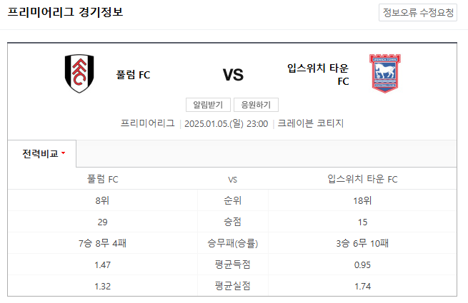 2025년 1월 5일에 예정된 풀럼 FC와 입스위치 타운의 경기는 잉글리시 프리미어리그(EPL) 2024-2025 시즌의 중요한 매치업 중 하나입니다.풀럼은 홈 경기의 이점을 살려 승리를 노리고 있으며, 입스위치는 강등권 탈출을 위해 승점이 절실한 상황입니다.