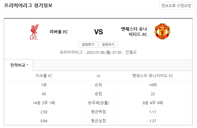2025년 1월 6일 오전 1시 30분(한국 시간), 리버풀과 맨체스터 유나이티드(맨유)의 프리미어리그 20라운드 경기가 안필드에서 열립니다.