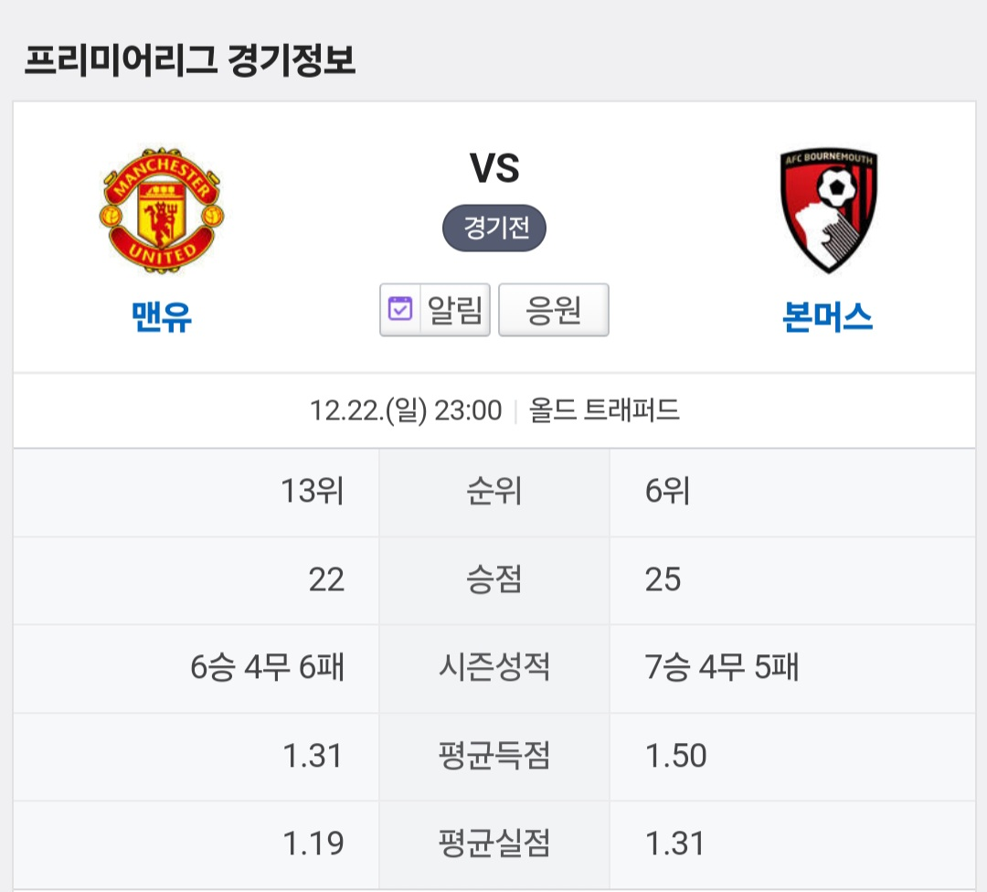 현재 맨체스터 유나이티드는 프리미어리그에서 16경기 중 6승 4무 6패로 22점을 기록하며 13위에 위치해 있습니다. 본머스는 7승 4무 5패로 25점을 기록하며 6위에 올라 있습니다.
