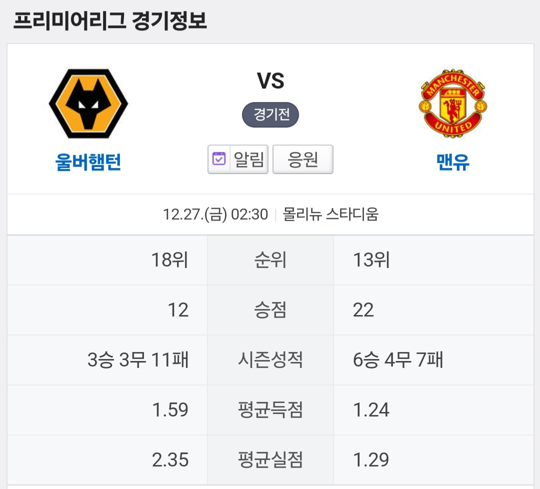 2024년 12월 27일, 울버햄튼 원더러스와 맨체스터 유나이티드의 프리미어리그 18라운드 경기가 예정되어 있습니다.