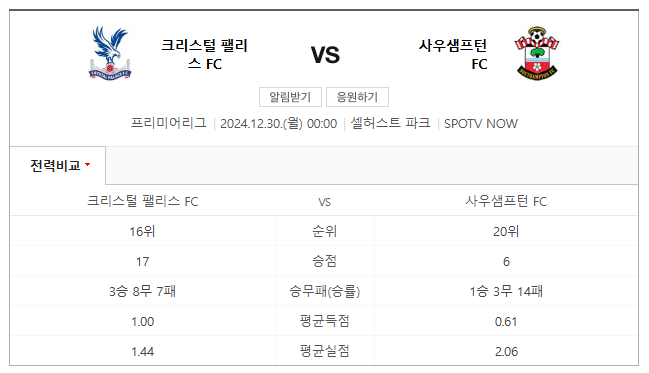 - 예상 스코어: 크리스탈 팰리스 2-1 사우샘프턴