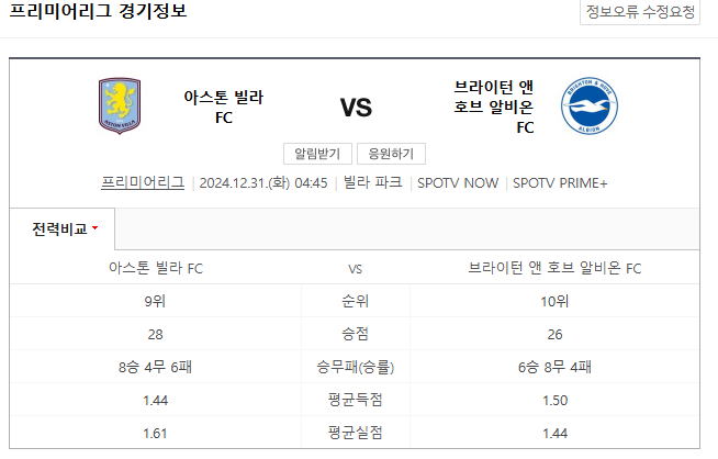 12월 31일 프리미어리그 경기 애스턴 빌라 대 브라이턴 브라이턴의 빠른 전환과 압박을 애스턴은 막을 수 있을 것인가/경기 예측/경기 분석