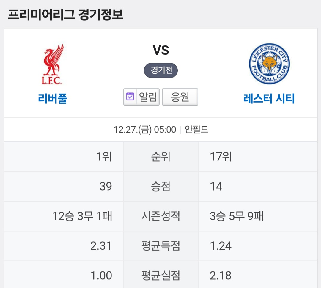 리버풀 FC와 레스터 시티 FC는 2024년 12월 27일에 프리미어리그 경기에서 맞붙을 예정입니다. 두 팀은 최근 22번의 맞대결에서 리버풀이 14승, 레스터 시티가 5승, 무승부는 3번 기록했습니다. 리버풀은 최근 좋은 폼을 유지하고 있으며, 레스터 시티와의 맞대결에서도 우위를 보이고 있습니다. 그러나 레스터 시티는 홈에서 강한 모습을 보여주고 있어, 치열한 경기가 예상됩니다.