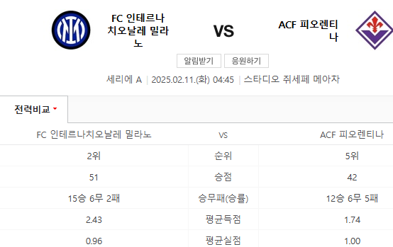 이번 경기는 2월 11일에 열리며, 인테르 밀란의 홈구장인 산 시로에서 진행됩니다. 두 팀의 현재 순위는 인테르가 2위, 피오렌티나가 5위로, 인테르는 리그에서 가장 강력한 팀 중 하나로 자리 잡고 있습니다. 피오렌티나는 최근 상승세를 타고 있어, 이번 경기가 더욱 흥미진진할 것으로 예상됩니다.