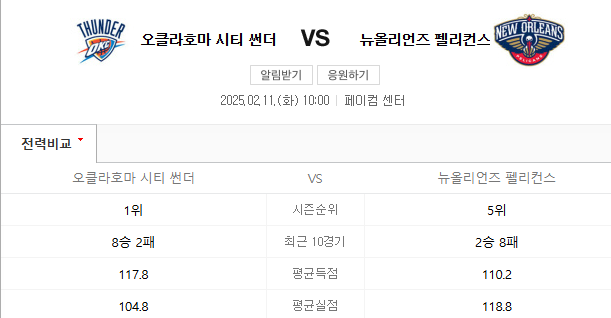 2월 11일 NBA 오클라호마 뉴올리언즈 오클라호마의 득점력과 패스 능력 보여줄 것인가/경기 분석/경기 예측