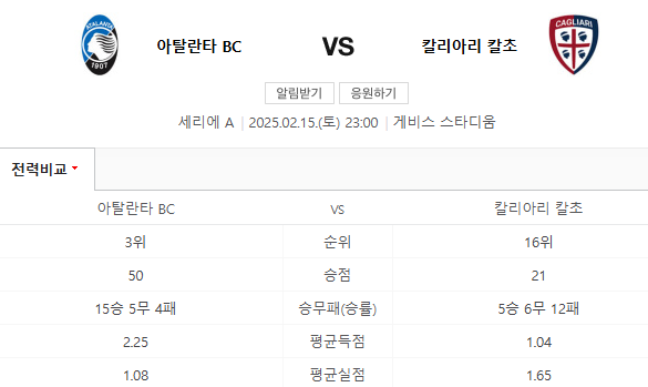 2025년 2월 15일, 아탈란타와 칼리아리는 격돌합니다. 아탈란타는 현재 리그에서 상위권을 유지하고 있으며, 칼리아리는 중위권에서 치열한 경쟁을 벌이고 있습니다. 두 팀의 맞대결은 항상 흥미로운 요소가 많아 팬들의 관심을 끌고 있습니다.