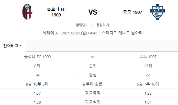 이번 경기는 볼로냐의 홈구장인 스타디오 레나토 다르아에서 진행됩니다. 볼로냐는 현재 리그에서 중위권에 위치하고 있으며, 코모는 하위권에서 벗어나기 위해 필사적으로 싸우고 있습니다. 두 팀 모두 승리를 통해 자신들의 목표를 달성하고자 합니다.