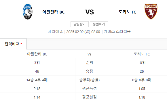 2월 2일 세리에 A 아탈란타 토리노 토리노의 강력한 체격과 조직력으로 아탈란타를 이길 것인가/경기 분석/경기 예측