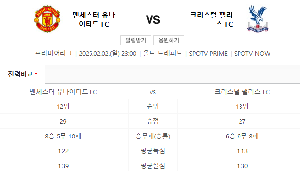 2월 2일 프리미어리그 경기 맨유 팰리스 팰리스는 이번 경기를 통해 자신들의 저력을 보여줄 것인가/경기 분석/경기 예측