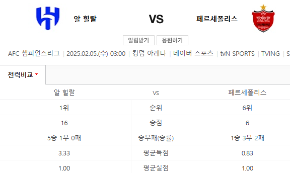 알 힐랄과 페르세폴리스는 아시아 축구의 강호로, AFC 챔피언스리그에서 자주 맞붙는 팀입니다. 이번 경기는 두 팀 모두에게 중요한 의미를 가지며, 승리할 경우 다음 라운드 진출에 큰 도움이 될 것입니다. 경기 장소는 알 힐랄의 홈구장인 킹 사우드 유니버시티 스타디움이며, 많은 팬들이 이 경기를 기다리고 있습니다.
