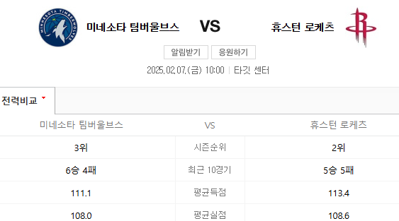이번 경기는 2024년 2월 7일에 열리며, 미네소타 팀버울브스와 휴스턴 로켓츠가 맞붙습니다. 두 팀 모두 이번 시즌에 대한 기대가 크며, 승리를 위해 최선을 다할 것입니다. 미네소타는 최근 몇 경기에서 좋은 성적을 내고 있으며, 휴스턴은 강력한 공격력을 자랑합니다.