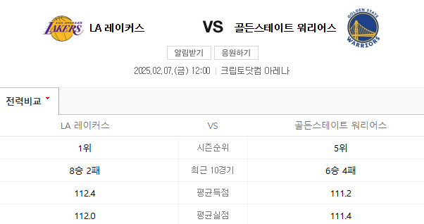 2월 7일 NBA LA레이커스 골든스테이트 워리어스의 빠른 템포와 외곽 슈팅을 보여줄 것인가/경기 분석/경기 예측