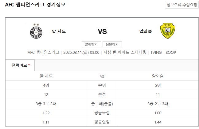 알 사드는 강력한 공격진을 바탕으로 빠른 역습을 선호하며, 알 와슬은 조직적인 수비와 중원 장악을 통해 경기를 풀어가는 스타일입니다. 두 팀의 전술적 접근 방식이 상반되기 때문에, 경기가 어떻게 전개될지 기대됩니다.