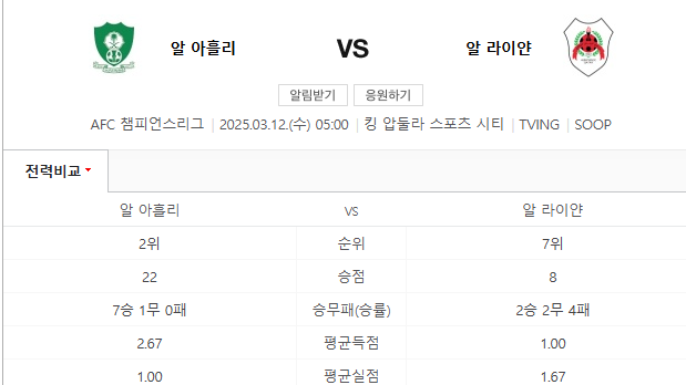 2025년3월12일 알 아흘리 알 라이얀 AFC 챔피언스리그 경기 분석/경기 예측