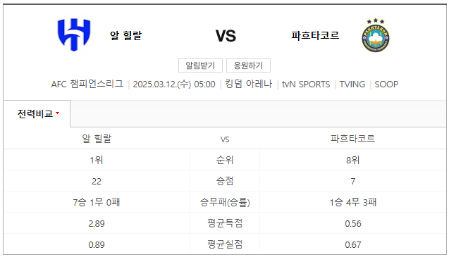 | 2025년3월12일 알 힐랄 파흐타코르 AFC 챔피언스리그 경기 분석/경기 예측 (0) | 2025.03.09 |