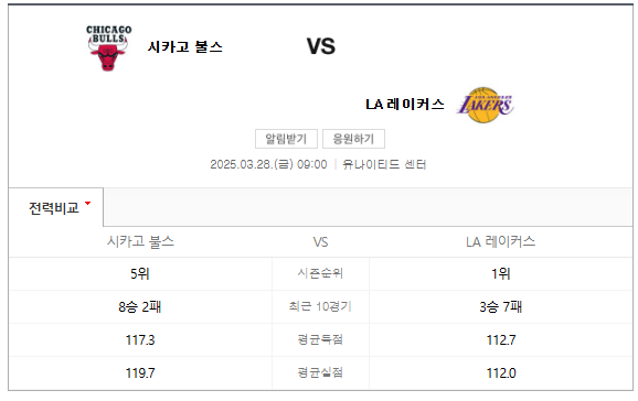 이번 경기는 2025년 3월 28일 오후 5시에 시카고의 유나이티드 센터에서 열립니다. 두 팀 모두 팬들의 기대를 한 몸에 받고 있는 만큼, 경기 당일 많은 관중이 몰릴 것으로 예상됩니다.