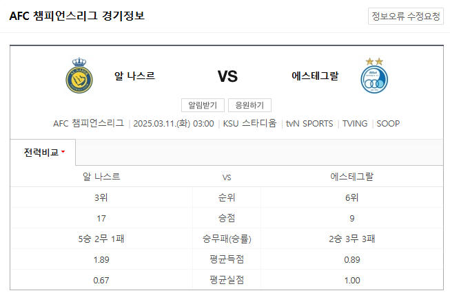 | 2025년3월11일 알 사드 알와슬 AFC 챔피언스리그 경기 분석/경기 예측 (0) | 2025.03.09 |