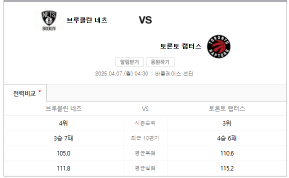 안녕하세요, 농구 팬 여러분! 오늘은 2025년 4월 7일에 열릴 브루클린 네츠와 토론토 랩터스의 경기에 대해 리뷰해보겠습니다. 이 경기는 NBA 시즌의 중요한 순간을 맞이하는 만큼, 많은 팬들의 관심을 받고 있습니다. 그럼, 경기 일정부터 살펴보겠습니다.