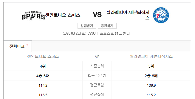 3월22일 NBA 샌안토니오 스퍼스 필라델피아 세븐티식서스 경기 분석/경기 예측