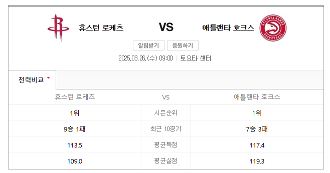 3월 26일 애틀랜타 호크스와 휴스턴 로케츠의 경기가 예정되어 있습니다. 이 경기는 NBA 정규 시즌의 중요한 한 판으로, 두 팀 모두 승리를 위해 최선을 다할 것입니다. 팬 여러분도 많은 관심 부탁드립니다!